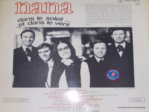 NANA MOUSKOURI “初めてのこと” 写真は、アルバム・タイトル≪NANA MOUSKOURI “DANS LE SOLEIL ET DANS LE VENT”≫(FONTANA 6399 014 1969 FRANCE)の洋盤LPの裏面です。このLPは、1969年に録音された曲で、全ての曲がフランス語歌詞で編集され、メロディ…
