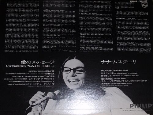 NANA MOUSKOURI “休み時間” 写真上は、アルバム・タイトル≪愛のメッセージ≫(PHILIPS FDX-317 1977)の邦盤LPの裏面で、彼女のレパートリー曲のほか、インターナショナルなナンバーを含めて全て英語歌詞で唄われているアルバムです。写真下は、アルバム・…