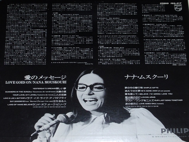 写真上は、アルバム・タイトル≪愛のメッセージ/ナナ・ムスクーリ≫(PHILIPS FDX-317 1977)の邦盤LPの表面で、写真下はその裏面です。このLPは、1976年にナナがオランダで録音したもので、彼女の従来のレパートリーの他にインターナショナルなヒット・ナンバーを含めて、全て英語歌詞で唄っております。このアルバムのプロデューサーはアンドレ・シャペル、伴奏オーケストラのアレンジと指揮は才人アラン・ゴラゲールが担当し、効果的なバックが彼女の歌の魅力を一層引き立たせています。