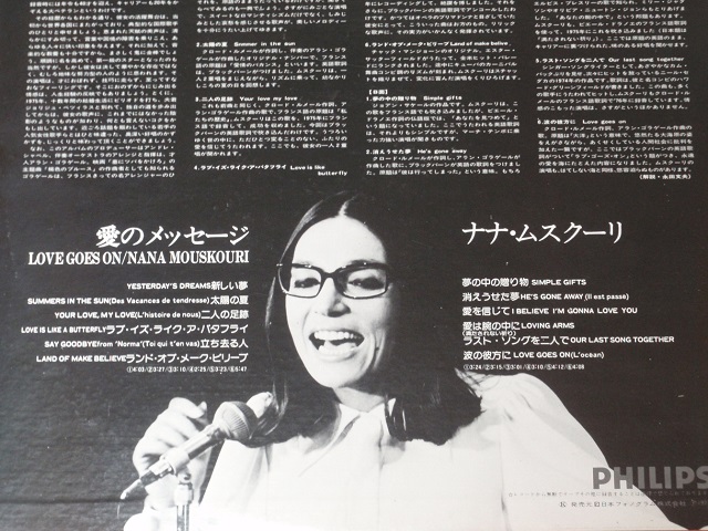 写真上は、アルバム・タイトル≪愛のメッセージ/ナナ・ムスクーリ≫(PHILIPS FDX-317 1977)の邦盤LPの表面で、写真下はその裏面です。このLPは、1976年にナナがオランダで録音したもので、彼女の従来のレパートリーの他にインターナショナルなヒット・ナンバーを含めて、全て英語歌詞で唄っております。このアルバムのプロデューサーはアンドレ・シャペル、伴奏オーケストラのアレンジと指揮は才人アラン・ゴラゲールが担当し、効果的なバックが彼女の歌の魅力を一層引き立たせています。